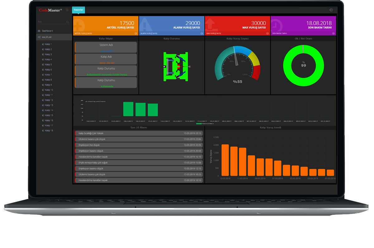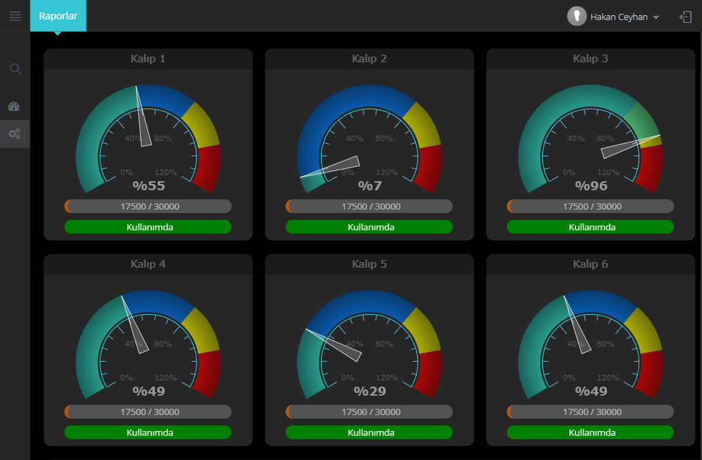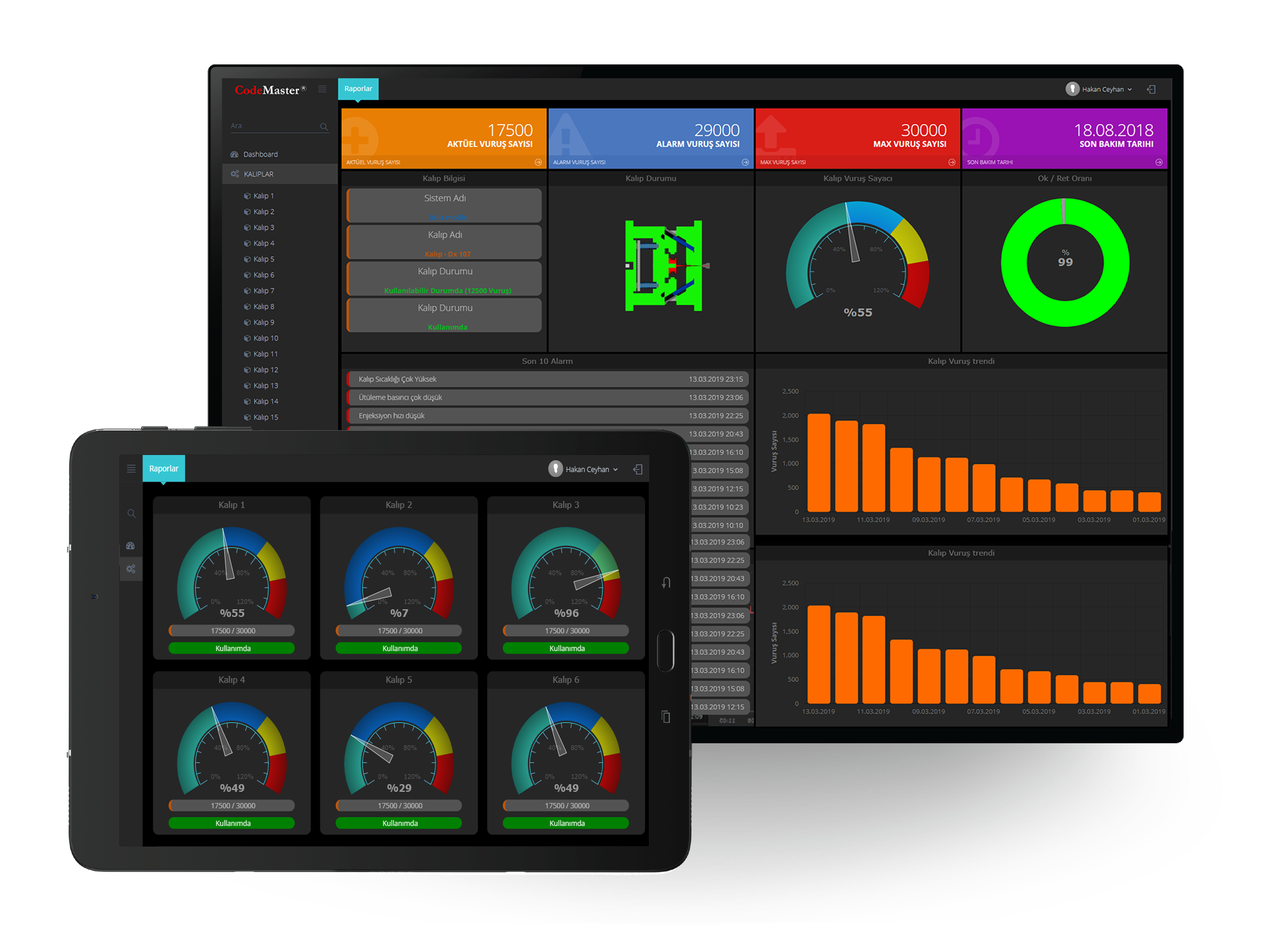 Yeni nesil web ve görsel nesnelerle dashboardlarda kalıp durumunu ve üretkenliği gerçek zamanlı olarak görselleştirin. Standart olarak kiosk ve andon üzerinden dashboardları izleyin.